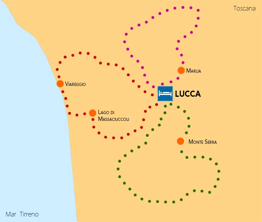 Inizieremo la tappa percorrendo in bici parte della cinta muraria. Usciti dal centro seguiremo l’argine del fiume Serchio e, immersi nel verde del lungo fiume, arriveremo al mare in località Marina di Vecchiano. Da qui rimarremo sempre vicino alle spiagge oltrepassando Torre del Lago, fino a Viareggio. Percorreremo il caratteristico viale dei Tigli fino al lago di Massaciuccoli che aggireremo prima di affrontare l’unica salita di giornata. Proseguiremo in discesa fino a ritrovare il fiume Serchio e, seguendone la sponda opposta a quella dell’andata, rientreremo nel centro di Lucca.