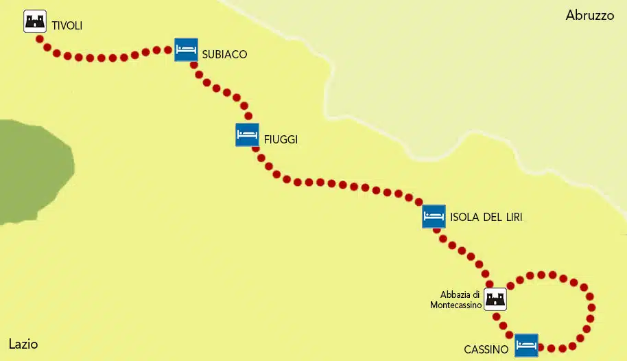 Pedaleremo fra paesaggi di rara bellezza, immersi nel verde e nella pace: seguiremo il fiume Aniene, visiteremo Subiaco (dove San Benedetto visse per oltre trent’anni), i monasteri di Santa Scolastica, ci inerpicheremo sui monti Simbruini, ci rinfrescheremo alle cascate di Trevi, risaliremo in quota attraversando i monti Ernici, visiteremo Isola del Liri e le sue famose cascate fino a raggiungere Cassino e la sua Abbazia, luogo magico e di raro fascino, dove sono ancora oggi conservate le spoglie di San Benedetto e di sua sorella Santa Scolastica e che segnerà il completamento della nostra avventura.