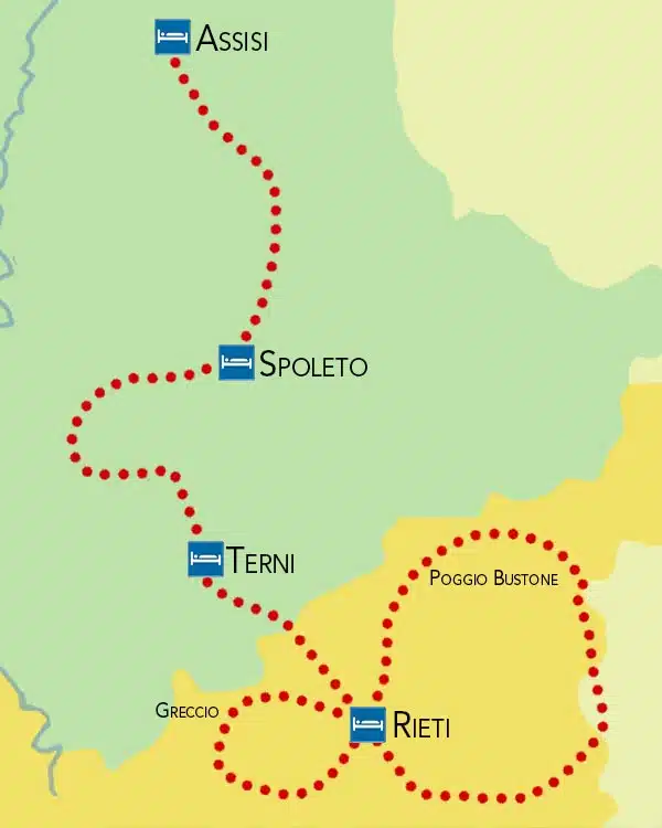 Dalla Valle Santa Reatina, caratterizzata dai 4 meravigliosi monasteri fondati da San Francesco, ci immergeremo nella verde Valnerina, seguendo il corso del fiume Nera. Entreremo in Umbria e raggiunta la maestosa cascata delle Marmore pernotteremo nel paese di Terni. Proseguiremo fra splendide colline e piccoli borghi immersi entrando nella Valle di Spoleto, territorio di rara bellezza con le sue numerose abbazie e i tanti centri storici ricchi di arte e storia. Lasciata la meravigliosa città di Spoleto proseguiremo il viaggio attraverso il territorio di Foligno per raggiungere infine Assisi, città natale di San Francesco e fulcro naturale del cammino. Qui termineremo il primo tratto del nostro viaggio e da qui lo riprenderemo per raggiungere il Santuario della Verna.
