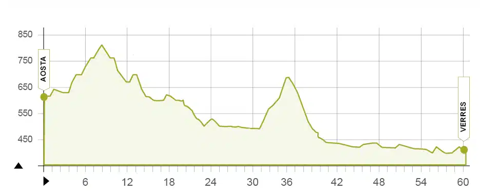 Pur non essendoci salite di lunghezza rilevante, in questa tappa l’unico tratto realmente pianeggiante è quello della pista ciclabile lungo la Dora Baltea; il rimanente è un saliscendi (molto panoramico) ininterrotto fino a Verres.